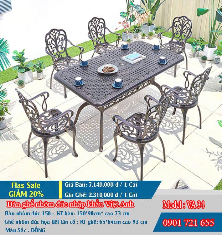 Bộ bàn ăn sân vườn 6 ghế nhôm đúc tân cổ điển